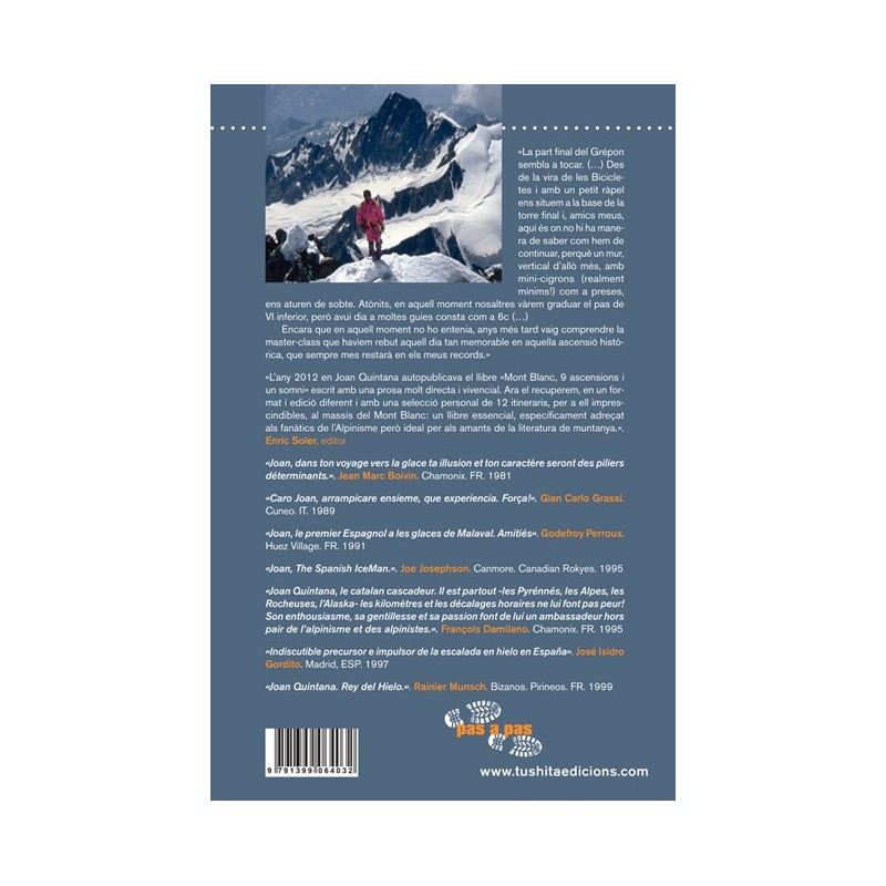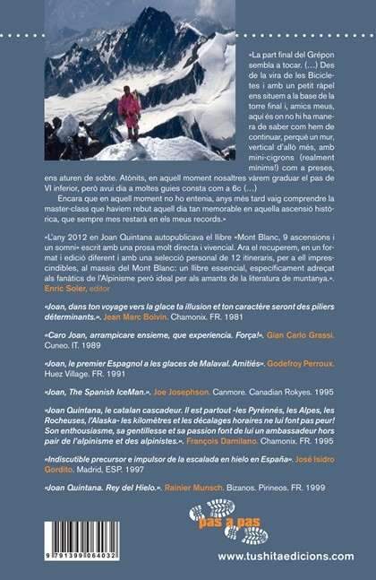 «Joan Quintana, le catalan cascadeur. Il est partout -les Pyrénnés, les Alpes, les Rocheuses, l’Alaska- les kilomètres et les décalages horaires ne lui font pas peur!Son enthousiasme, sa gentillesse et sa passion font de lui un ambassadeur hors pair de l’alpinisme et des alpinistes.». François Damilano. Chamonix. FR. 1995